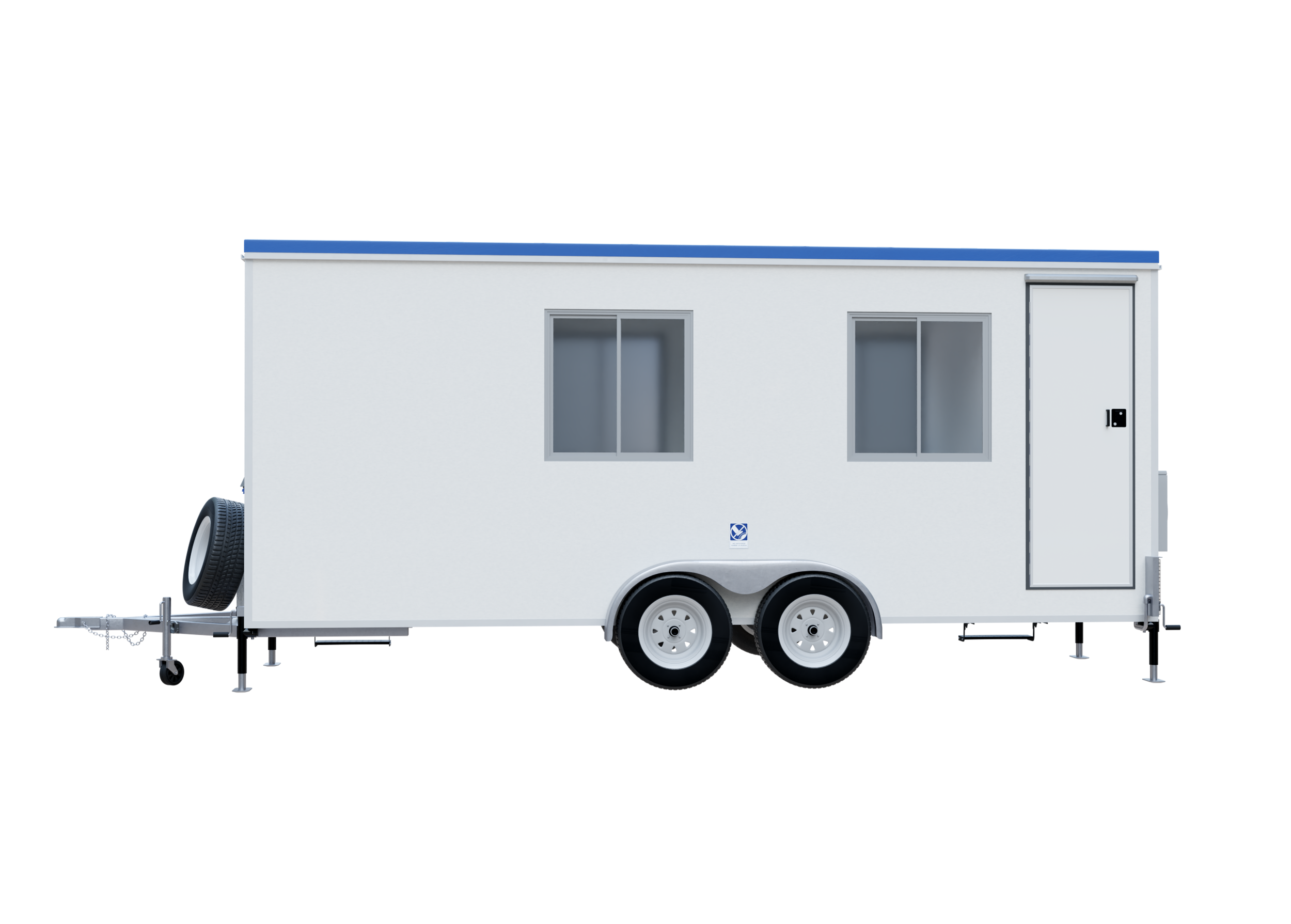 Espacio de trabajo móvil para 5 personas, equipado con baño, con estanques de agua de gran capacidad y opciones de mobiliario, ideal para mantener la productividad en operaciones en campo.
