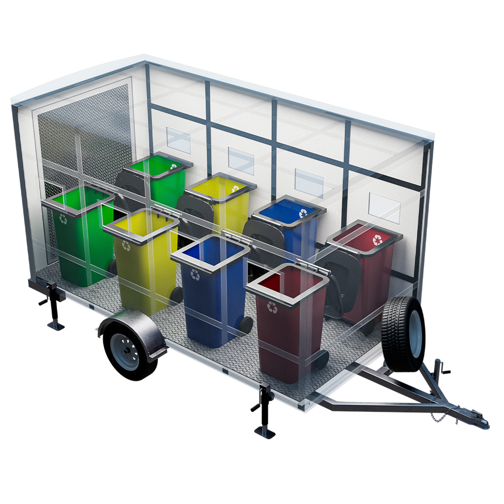 Módulo móvil diseñado para albergar hasta 8 contenedores de basura o reciclaje, con ventanas de acceso que facilitan la recolección y organización de residuos en terreno.